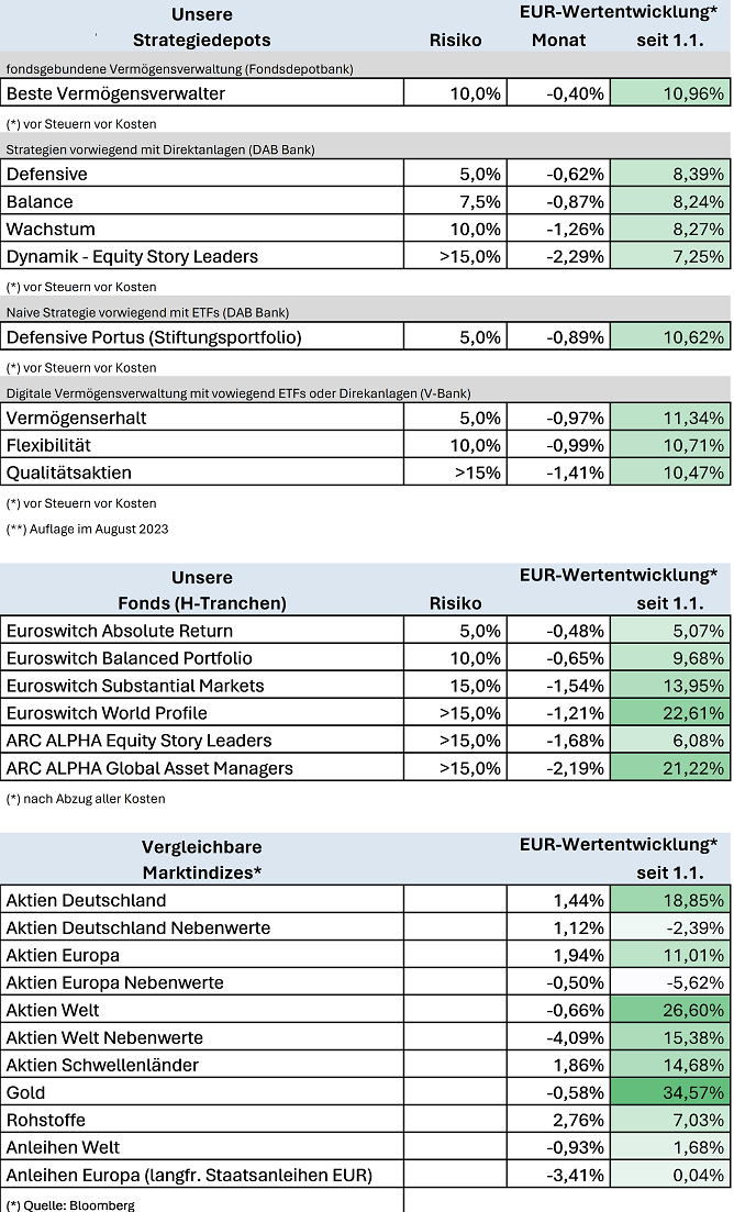 Die Wertentwicklung per Monatsultimo vergleicht sich seit Jahresbeginn mit der Morningstar-Kategorie „Aktien weltweit Flex-Cap“ (-1,91 % im Monatsverlauf auf +13,63 % seit Beginn des Jahres) und der Wertentwicklung des Weltaktienindex MSCI World NR Index in Euro mit -0,66 % im Monatsverlauf auf +26,60 % seit Jahresbeginn – erneut getragen von der US-Wertentwicklung, die mittlerweile mehr als 70 % des Index bestimmt. Auch der im Jahr 2024 gegenüber dem Euro um 7 % gestiegene US-Dollar hat die relative Wertentwicklung begünstigt.