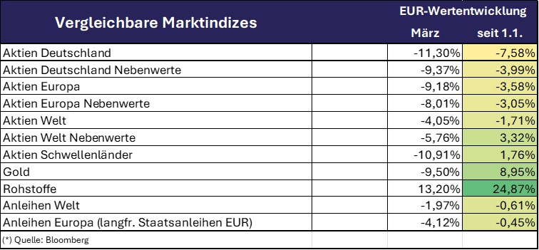 Der März hat einen Großteil der Buchgewinne des Jahres vor allem bei Aktien und Gold gelöscht. Allerdings war eine Korrektur unabhängig vom Krieg notwendig, da viele Bewertungen bereits eine perfekte Welt einpreisten – teilweise unterstützt von stark spekulativen Käufen.